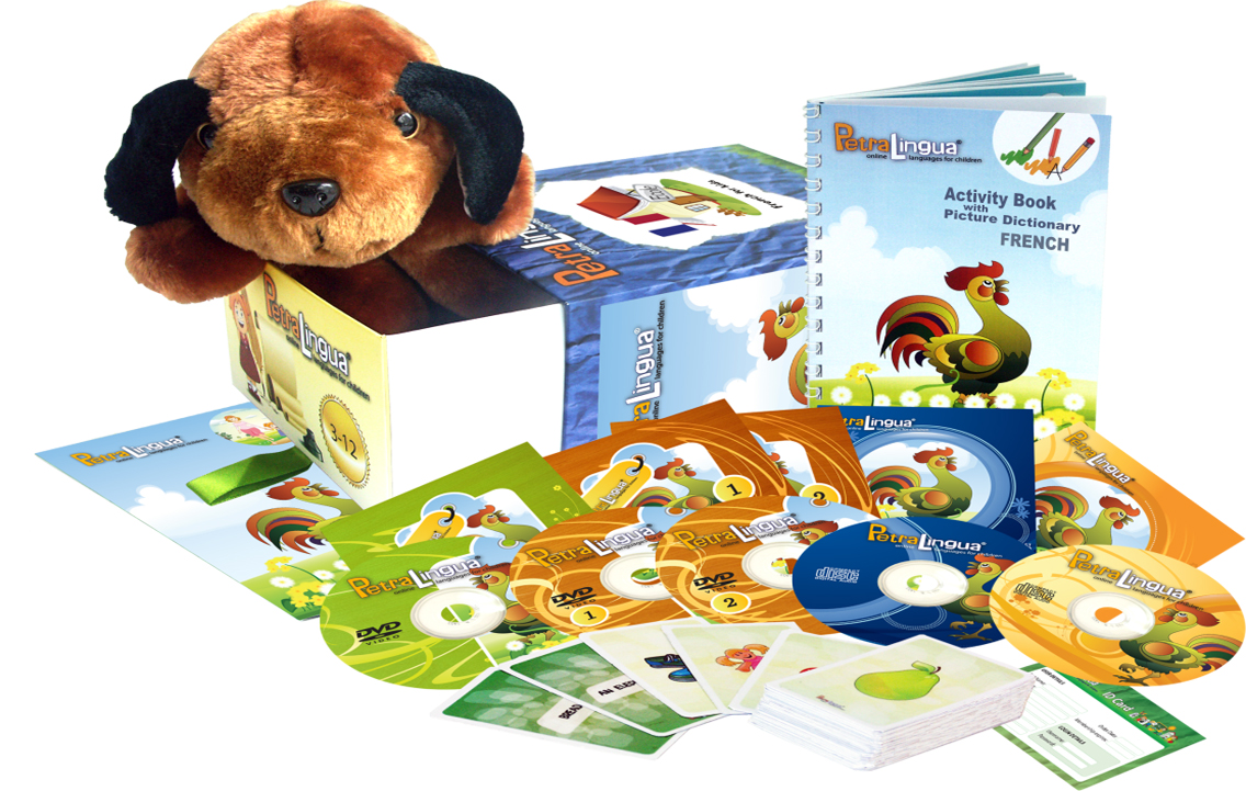 With the complete PetraLingua® French for kids set your kids are now able to enjoy our colorful French learning videos on DVD, listen to all the songs from the course on CD and practice what they have learned with their French activity books!